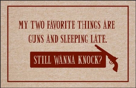 Home » Decor » My two favorite things are guns and sleeping late … Doormat Decor My two favorite things are guns and sleeping late … Doormat January 4, 2013 52 100% Olefin Indoor/Outdoor Carpet.Price: $19.95
