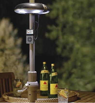 The cordless light clamps onto an umbrella pole and has a standard headphone jack for use with iPods , stereos, or other media players.