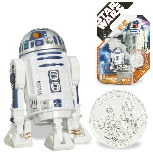 Based on the character from the epic Star Wars saga, this R2-D2 action figure has detailed styling and features electronic lights and sounds. Figure comes with an exclusive collector coin!