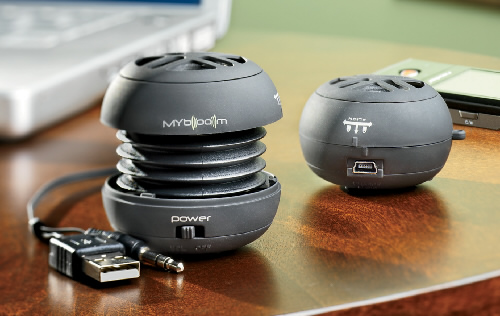 Plug it to your laptop, MP3 player or other portable sound system, twist it open and extend the accordion-like center, and you’ve got a mighty mite of a speaker with a real bass boom. Cord has both USB and audio jack plugs.