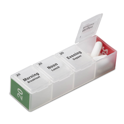 With it, your medications are organized in 31 daily pill boxes in each of four time periods (morning, noon, evening, night). A persistent alarm sounds when it’s time to take a pill. There are also red and green indicators to let you know for sure what you’ve already taken.