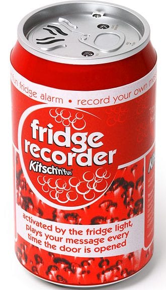 Home » Gadgets » Recording Can Fridge Guard Gadgets Recording Can Fridge Guard March 23, 2009 62 This hilarious little gadget is shaped like a standard drinks can that can blend into any fridge. It’s light activated, so whenever someone opens the fridge door, the recorded message will play! link