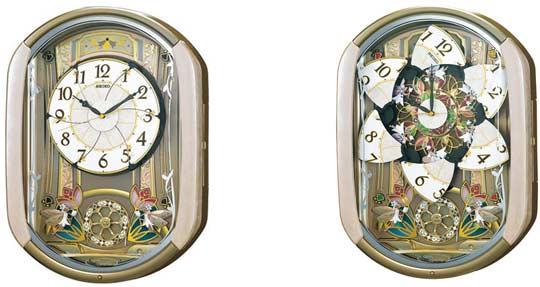 Introducing the first alarm clock that tells time according to the rhythm of your life. The Seiko Dynamic Melody marks important times and dates with a beautiful mechanical dance, accompanied by a melody that you select. Below, a Swarovsky-crystal-studded wheel rotates, flanked by two sprites and a floral motif.