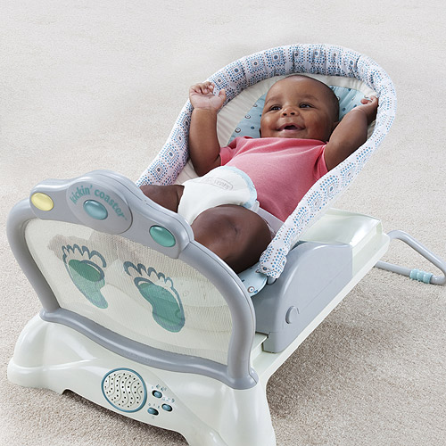 The Kickin’ Coaster is a soothing infant seat with removable, soft head support – providing soothing music, vibration, and twinkling lights for when baby needs to rest. At meal time, the seat is perfect for feeding, just engage the locking clip!