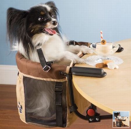 The high chair clips securely to tables up to 2″ thick and its height adjusts without tools to elevate your pet to near eye level. It has a frame of powder-coated 5/8″ steel tubing and its arms are rubber-coated so they will not mar table surfaces. By providing an alternative to sitting on your lap, running disruptively underfoot, or outright banishment, the chair assuages a pet (and its owner’s) frustration, and promotes more refined behavior.