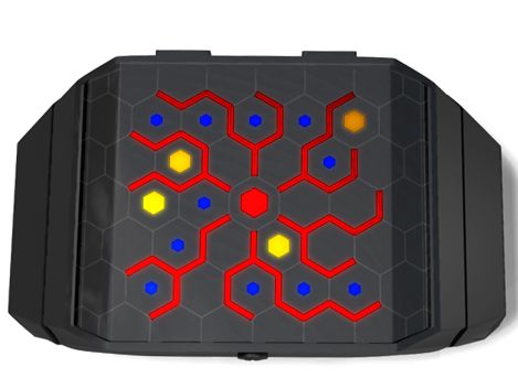 Each red line from the center to the edge shows an hour in the same position as hours on a regular clock face. Groups of 5 minutes are shown with blue dots, positioned at 5 minute points like on a clock and single minutes 1-4 are shown with four yellow dots..