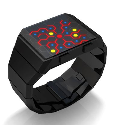 Each red line from the center to the edge shows an hour in the same position as hours on a regular clock face. Groups of 5 minutes are shown with blue dots, positioned at 5 minute points like on a clock and single minutes 1-4 are shown with four yellow dots..
