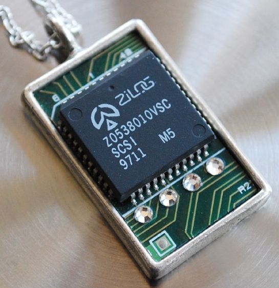 Necklace made from a recycled computer circuit board featuring a large chip and 4 small Swarovski crystals.