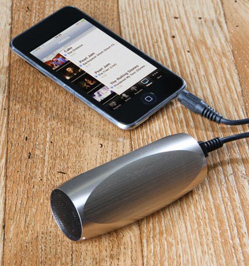 It even has a built-in mp3 player and rechargeable battery, so it can play music without being connected to anything. Now you have a choice – connect it to your iPod or leave your iPod at home and just bring your tunes and your speaker. You can even attach it to your bicycle handlebars and menace the neighborhood.