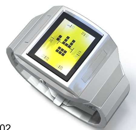 A concept with an always on LCD display and user selectable LED backlighting. The hour is shown in digits in negative space in the center of the display, minutes are shown by the ring of blocks surrounding the digits. The first rotation of minutes in positive blocks to 30 minutes, then the second rotation in negative blocks to 60. There are markings to help indicate the current position.