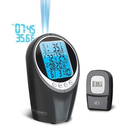 Use wireless technlology to project a glowing clock display and current outdoor temp on any ceiling. Indoor and outdoor temps, indoor humidity, time and date.