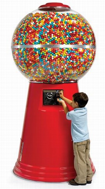 The same monolithic vending machine found in arcades, amusement parks, and novelty shops, this is the 7′ tall gumball machine that holds over 14,000 gumballs. It uses the Beaver mechanism–the classic zinc machined coin mechanism used in gumball machines since the 1960s–triple chrome-plated and precisely machined to provide decades of iconic “click-clack” sound when dispensing.