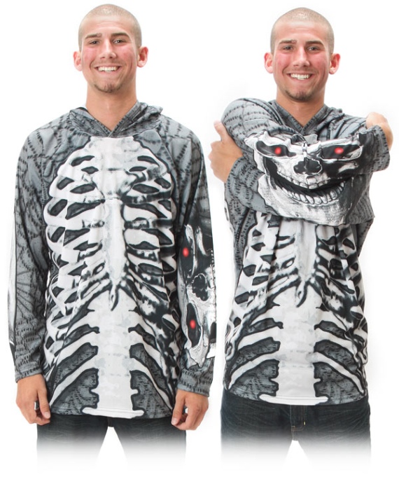 Front and back are grey with a skeleton print on a black webbed design. Arms fold to reveal skull with glowing red eyes. Printed with eco-friendly inks on recycled fabric.