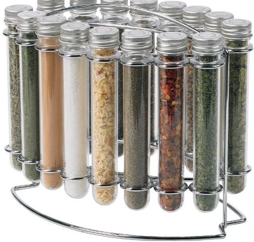 The Tube is a 16-bottle spice rack. It includes 16-tubes filled with savory spices. Rack made of steel. Tubes allow for easy, one-hand use. Requires minimal counter space.