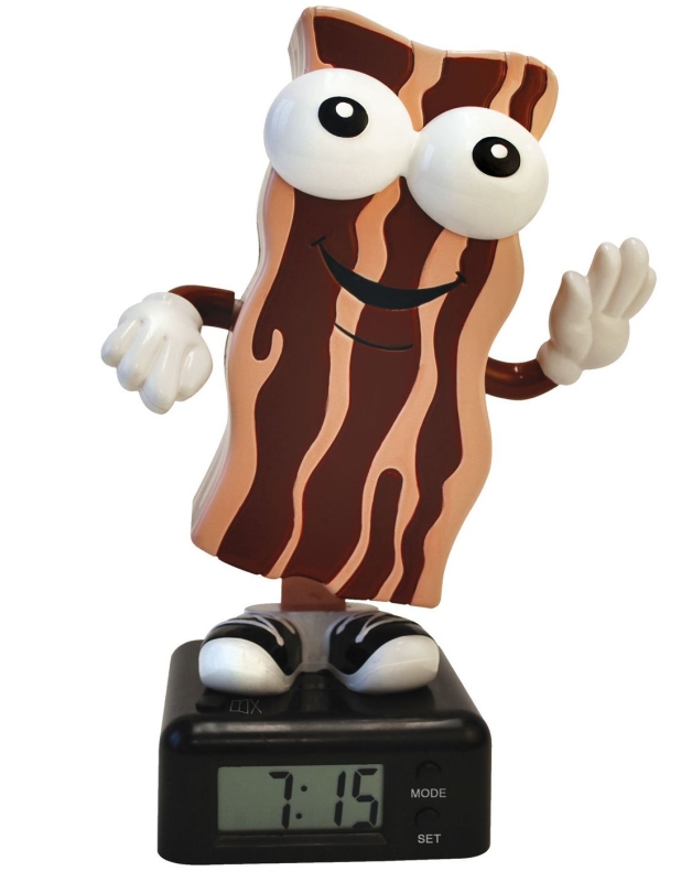 The silly bacon dude dances, raps and sizzles to wake you up in a new and exciting way. Set the alarm and awake to him rapping about his love of bacon and the sizzle of bacon cooking.