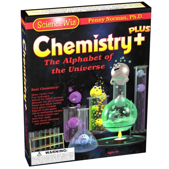 Flame test alkali metals, grow giant crystals and explore noble gases; Includes a full-color 48 page instruction book and materials; Authored by Penny Norman, PhD and edited by Ann Einstein.