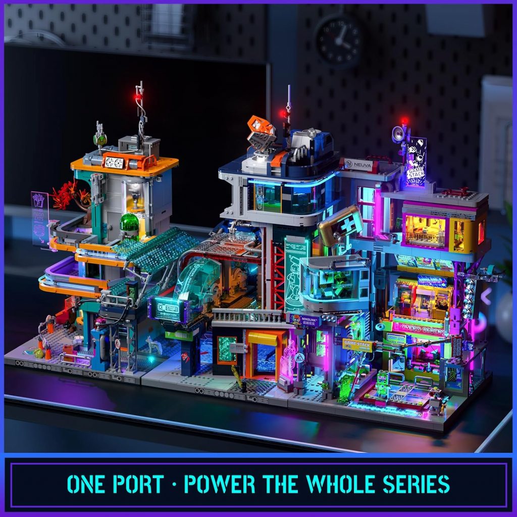Powering the display is simple with the innovative MODULAR LIGHTING SYSTEM. You can illuminate your entire Cyberpunk Neon City block with just one single USB cable. This system connects all modular buildings seamlessly, eliminating messy, tangled wires. The built-in street power grid allows you to effortlessly create a fully illuminated custom cyberpunk block with simple and hassle-free setup.