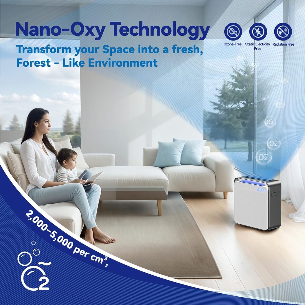 This advanced air purification system features the proprietary Nano-Oxy Module. Using Nano-Oxy Technology, the system releases eco-friendly negative oxygen ions (NOIs) that are easily absorbed by the lungs and are completely free from ozone, radiation, or static electricity. NOIs are known to support better breathing, boost energy and mood, reduce stress, and significantly improve sleep quality. With concentrations reaching 2,000 to 5,000 ions per cubic centimeter, the Nano-Oxy Generator effectively creates a refreshing, forest-like atmosphere within your home or office.