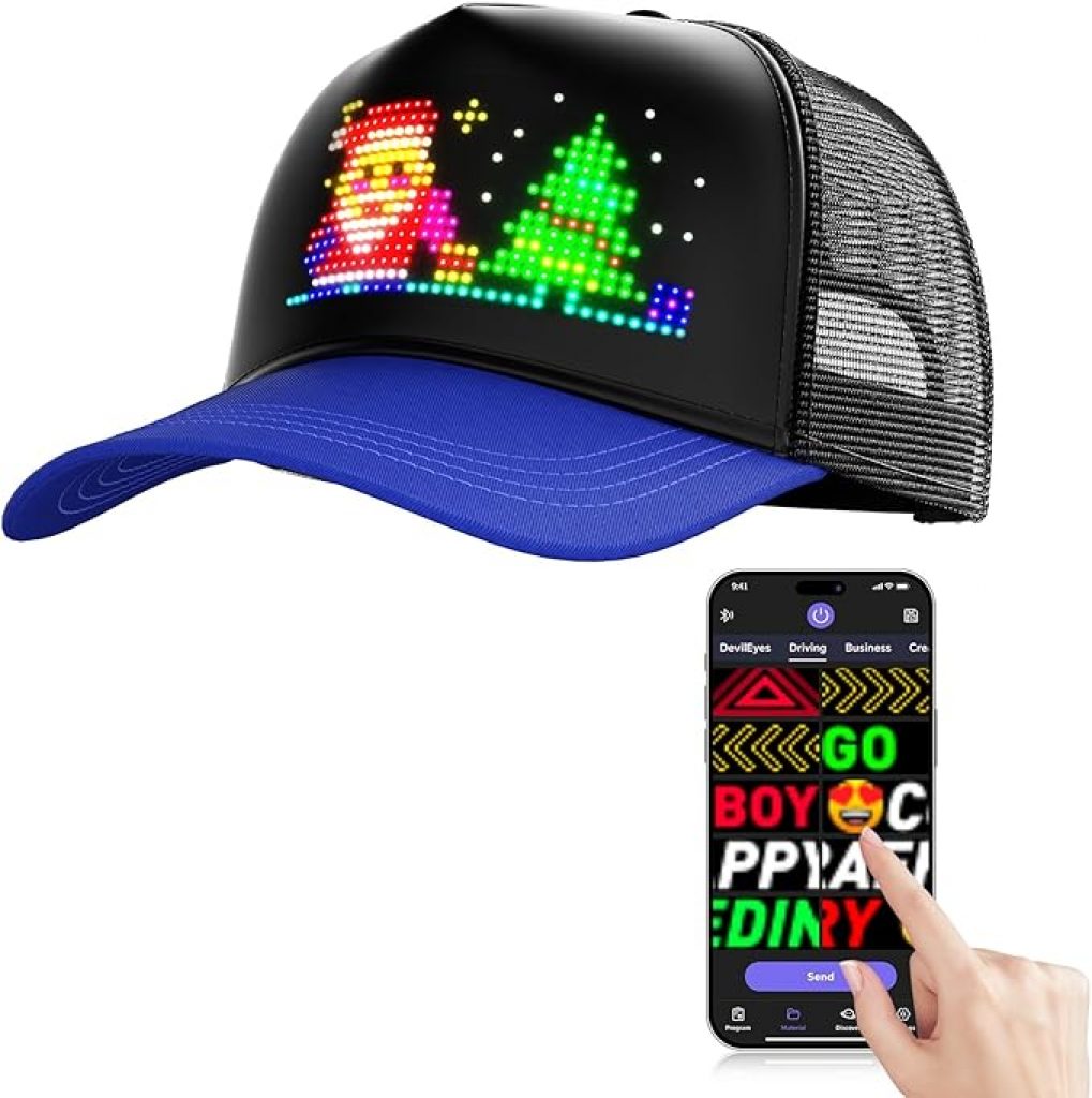 - Innovative LED Display: This smart cap features a built-in LED display screen that allows you to customize text, patterns, and animations using a Bluetooth app.