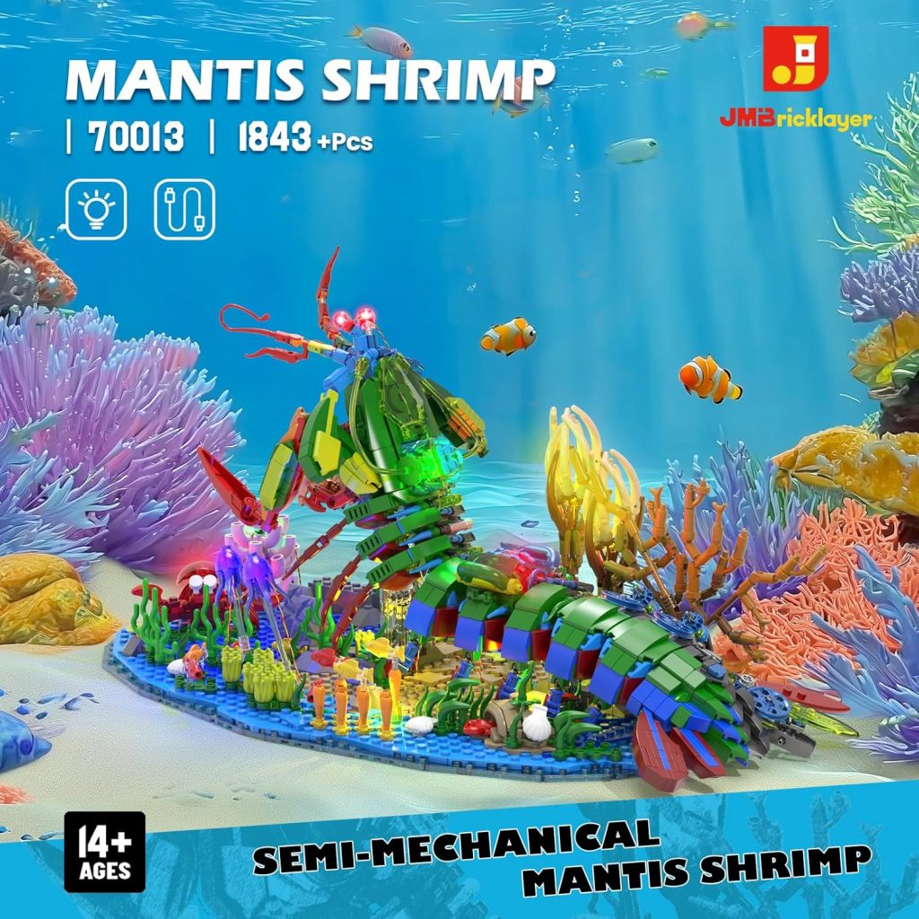 This extraordinary building block set for adults is inspired by the mantis shrimp, a sea creature known for its powerful forelimbs used for predation and defense. Originally designed by JMBricklayer, the model uses the mantis shrimp as its core subject, blending unique bionic form with a mechanical structure for a double-sided design that captures both biological realism and a futuristic mechanical sense. The core figure is surrounded by small fishes, jellyfish, crabs, and corals, creating a visually rich and detailed underwater ecological scene.