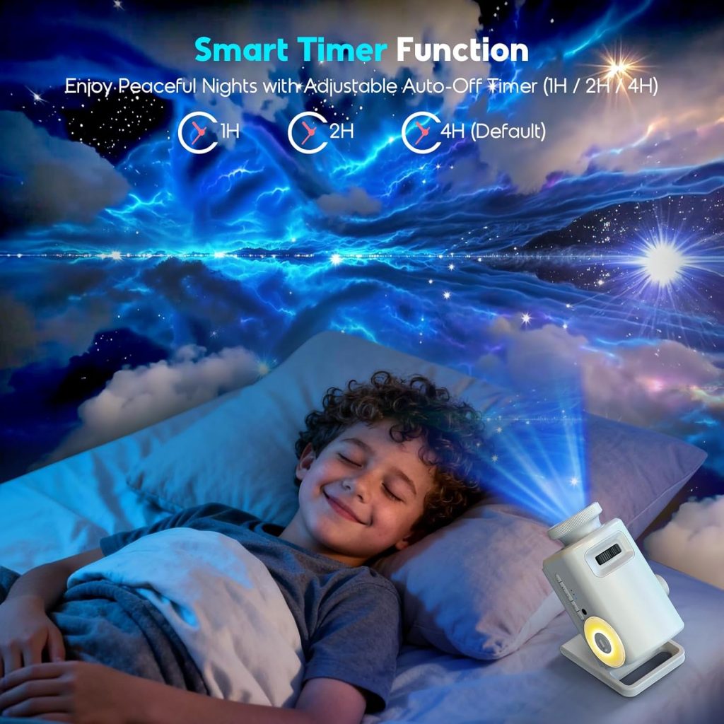 More than just a galaxy projector, it also serves as a RELAXING NIGHT LIGHT and features an AUTO TIMER. The convenient timer function includes several preset durations (1 hour, 2 hours, 4 hours), making it hassle-free to turn the light on or off without any worries. The multiple brightness levels allow you to create either an energetic party atmosphere or serve as a soft night light, which is perfect for children who have issues with total darkness at night. For adults, it is perfect for relaxation, meditation, or simply unwinding after a long day.