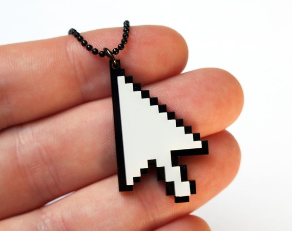 Created by Israeli artist Ran (aka milkool), these pendants offer up chunky, pixely cursors hanging from a black metal ball-chain. They’re made from 2 layers of colored acrylic, stacked together, so they have some nice dimension too.