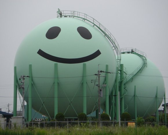 Local gas companies occasionally add a touch of character to the giant spherical gas containers that dot the landscape of Japan.