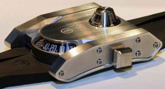 This watch is made from titanium, and the hours are displayed on the small dome on top of the watch. The numbers rotate by and are easy to view and read. The minutes rotate by on the large front window that looks like a windshield.