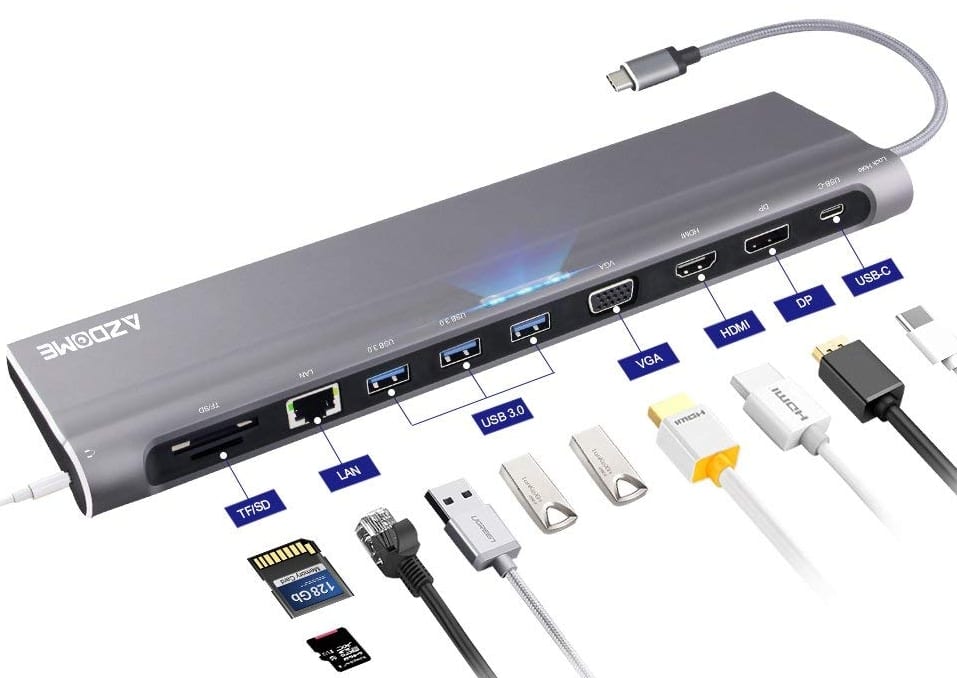 Home » Gadgets » 12 in 1 Multi-Port USB 3.0, Secure Docking Station with Charging Power Gadgets 12 in 1 Multi-Port USB 3.0, Secure Docking Station with Charging Power February 6, 2019 219 This dual-monitor USB 3.0 docking station lets you connect your Mac or Windows laptop to two monitors.With just a single cable, your laptop gains full desktop capabilities. This USB 3.0 docking station combines USB 3.0, headphone and microphone audio connectors, and a Gigabit Ethernet RJ45 port into a single docking station.Support to connect a 4kx2k@30Hz HDMI display OR a 4kx2k@30Hz DisplayPort monitor OR a 1920×1080@60Hz VGA display; Always be prepared to connect to an available UHD TV, monitor or projector.3 USB 3.0 ports allowing to connect multiple USB peripherals. Support faster data transfer up to 5Gbps, backward with USB 2.0/1.0. The total output of the 3*USB3.0 USB-A is 10W(5V@2A) max.Built in SD and TF slots easily access files from universal SD and Micro SD memory card; Support 2 cards reading simultaneously. 1000Mbps RJ45 Ethernet port definitely ensures more stable and faster wired network connection .
