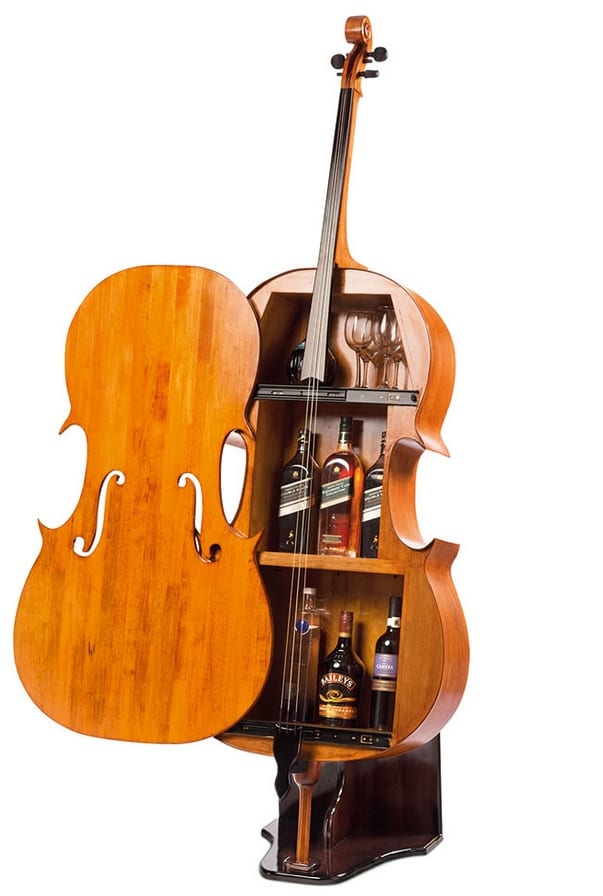 Home » Gadgets » The Cellist Cocktail Bar Gadgets The Cellist Cocktail Bar February 7, 2019 65 This is the decorative cello that slides opens to reveal a symphony of spirits and stemware. Designed after a full-size 4/4 modern cello, it contains f-shaped sound holes, tuning pegs, and a classic top scroll—yet its absence of a bridge may make unschooled orchestra-goers question if it’s Baroque. The cabinet’s top, middle, and bottom shelves provide 8 1/2″, 14″ and 14 3/4″ of vertical storage, respectively, that accommodates stemware or barware and libation bottles of various sizes. Although not intended to be played, the faux instrument provides string-concert enthusiasts with access to a brandy or Bordeaux for harmonious quaffing to Bach’s cello suites or Beethoven’s Triple Concerto. Ideal for sophisticated entertaining in a parlor or study, it rests on an included wood stand, is constructed from tropical hevea brasiliensis, and is treated for protection against pests and moisture.