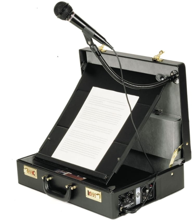 Home » Gadgets » The Orator’s Briefcase PA System Gadgets The Orator’s Briefcase PA System February 13, 2019 106 This briefcase converts into a lectern and battery powered public address system in seconds, providing a convenient platform for organizing presentation materials and amplifying lectures. The built-in sound system has a 20-watt amplifier and dual, 4″ speakers that produce crisp sound from the briefcase’s front panel, ensuring crystal clear orations. The 14″ by 15″ lectern props up the briefcase and easily accommodates legal pads and note cards. The unit provides two microphone options–a handheld condenser microphone with nine feet of cable and a 3/4″ lavaliere model that clips to a tie or lapel. The control panel on the side of the briefcase enables tone and volume adjustments and the 13″ gooseneck arm attaches to the briefcase and secures the handheld microphone at your preferred height. All components store inside the briefcase with room to spare for documents, the attaché combination lock provides optimal security, and line-out ports enable connection to external speakers and a tape recorder.