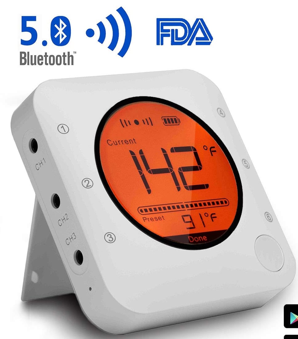 With this bluetooth wireless thermometer, you can monitor the temperature of food at any time on your phone with up to 100ft (indoor)/196 ft outdoor range, the real-time push notification will be sent to your phone when food is ready. ENJOY the gathering time while cooking!