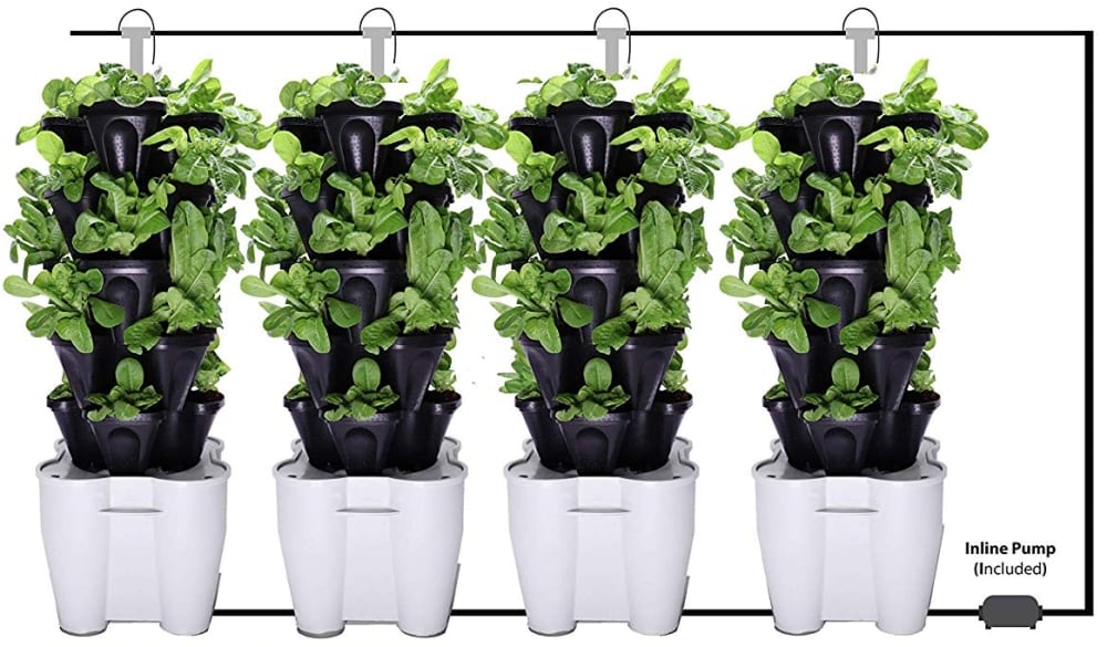 Home » Garden » 4 Tower Garden System Garden 4 Tower Garden System February 27, 2019 90 DIY Vertical recirculating garden stacks 80 plant sites in a 2’x9′ footprint Grow lettuce, tomatoes, peppers, strawberries, herbs, and flowers in the same containers with the same nutrient recipe! Hydroponics feeds nutrients at optimal times for optimal growth. Plants grow bigger, faster, and healthier when fed hydroponically. Automatic drip irrigation system is set and forgot. The automatic timer turns the pump on/off. No more guessing games with watering or worrying about leaving town. Garden from a natural, standing position. No more bending over, tilling, weeding, or ammending the soil. Nutrients & Growing Medium included too! Specifically designed to provide superior nutrition during all stages of growth. This vertical tower kit installs in the ground and can be installed in apartments, balconies and patios. This DIY vertical recirculating kit is an urban gardeners dream. The automatic garden system includes everything needed to run by itself. The timer automatically turns the pump on to feed the plants every day at the same time.