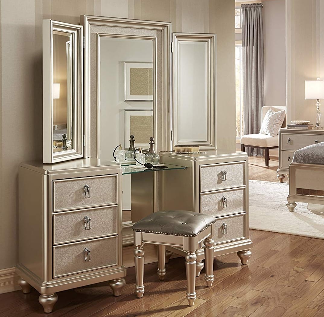 Glamour meets function in Diva resulting in an irresistible combination. Diva has a lustrous platinum finish, textured shagreen panels, bright jewelry-inspired hardware, and mirror-panel borders for an extra touch of bling.Features :Finish: SilverVanity Dimensions: 32″ H x 63″ W x 19″ DMaterials: Select Hardwoods, MDF, Mirror, Fabric, Foam6 drawersGlass shelf in the centerJewelry tray in top left drawerUpholstered stool included with vanity has a lift top for added storage