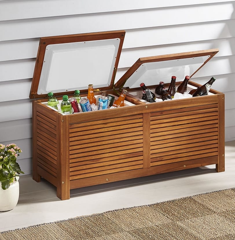 Home » Garden » The Two Cooler Patio Bench Garden The Two Cooler Patio Bench March 1, 2019 229 this is the outdoor two-person bench that opens to reveal two separate coolers under the seat. The seat swings upward with sturdy hardware that keeps it in-place hands-free and its two .32′ cu. coolers store ice and drinks; each has a drain valve. Made from 100% Forest Stewardship Council-certified Acacia wood—with a Janka hardness rating twice as high as African mahogany—the bench supports up to 440 lbs. Left alone, the Acacia wood will develop a unique silvery gray patina, or it may be oiled to retain its original appearance.