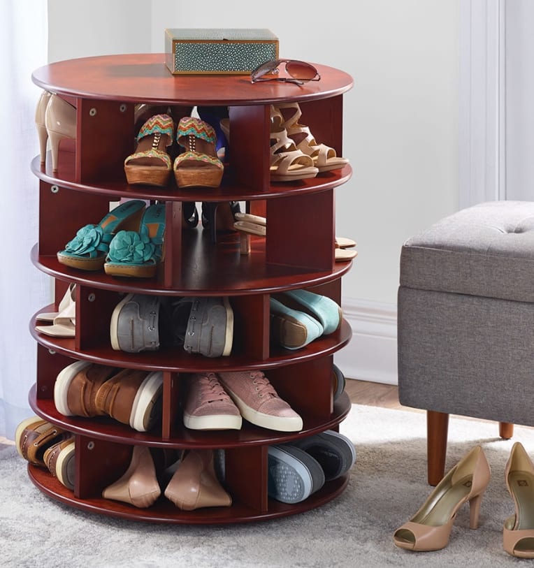 Home » General » The 25 Pair Shoe Turntower General The 25 Pair Shoe Turntower August 9, 2019 56 This is the elegant wooden tower that neatly stores up to 25 pairs of shoes and rotates a full 360° for easy access to all footwear. Its five levels are each subdivided into five cubbyholes for shoe storage that are large enough for men’s or women’s dress and casual shoes of all sizes and types. A spin of the smoothly turning tower quickly locates the pair you want. The turntower provides simpler retrieval than storing shoes in boxes, and its compact design ensures that mates remain in tidy, orderly pairs. Unlike lesser shoe storage systems, the turntower shoe rack is made from birch veneer construction with a rich walnut stain.