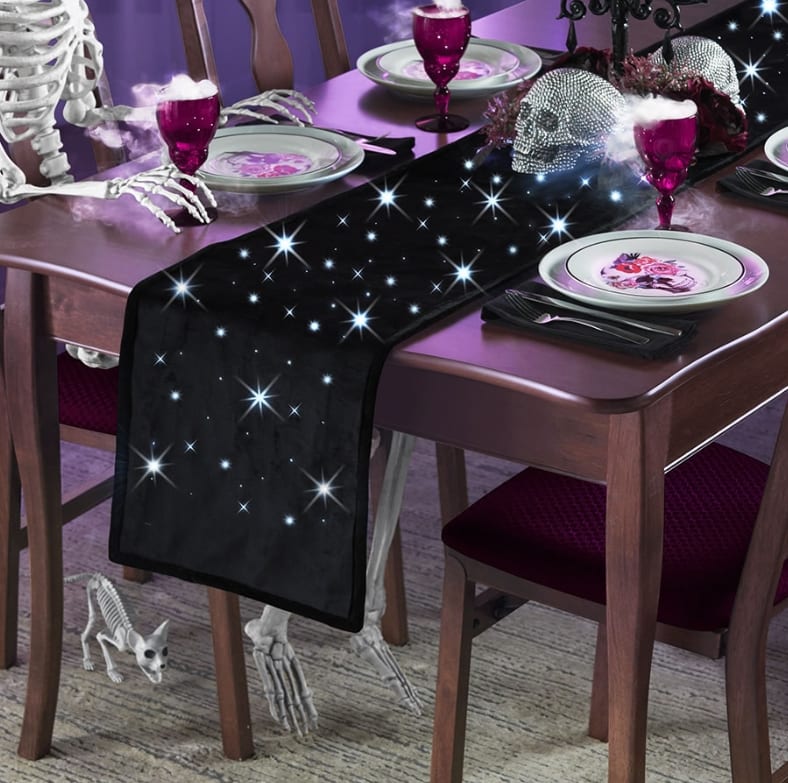 this is the cordless table runner that twinkles with the light of a bewitching night. Made from rich velvet that protects a table’s surface, the 72″ L x 14″ W runner has 16 white LEDs that provide an eerie glow to a Halloween tabletop display. A multitude of tiny white light dots generated by 130 fiber optic strands imbedded in the fabric impart a twinkling to the entire runner.