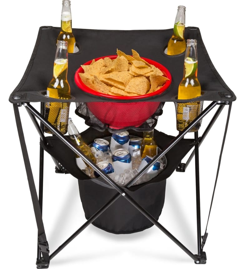Home » General » The Portable Party Table General The Portable Party Table August 8, 2019 49 This is the portable table with an insulated cooler and built-in holders for snacks and drinks. Ideal for beach parties, backyard barbecues, outdoor concerts, or camping, it sets up in minutes yet has a sturdy steel frame and durable 600-denier nylon surface. Its 13″ diameter cooler has a waterproof liner, zippered top, and holds up to 24 12 oz. cans of your preferred beverage. Its center net holds an existing bowl of popcorn, chips, or other snacks, and four corner cup holders keep drinks secure.