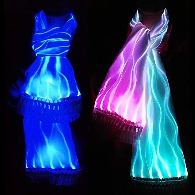 Home » Gadgets » Light Up Luminous Scarf Gadgets Light Up Luminous Scarf August 22, 2019 48 2019 New LED light up scarf glows in 7 colors – Red, Green, Blue, White, Light Blue, Purple & Gold; And 5 Light Mode – Monochrome, Flash, Gradual, Smooth, Polychromatic.Sizing at 53.15×7.87 inches (including tassels is 66.93×7.87 inches), our luminous glow scarf is made from high-quality fiber optic fabric,, silk surface, soft and comfortable, no heat, no radiation, harmless to the human body. Absolutely quality assured.The LED glowing scarf includes two battery box, which offers various glowing colors with button control. USB charging for 2 hours will keep the light working for 3-4 hours. (Working period differs by different light up mode).