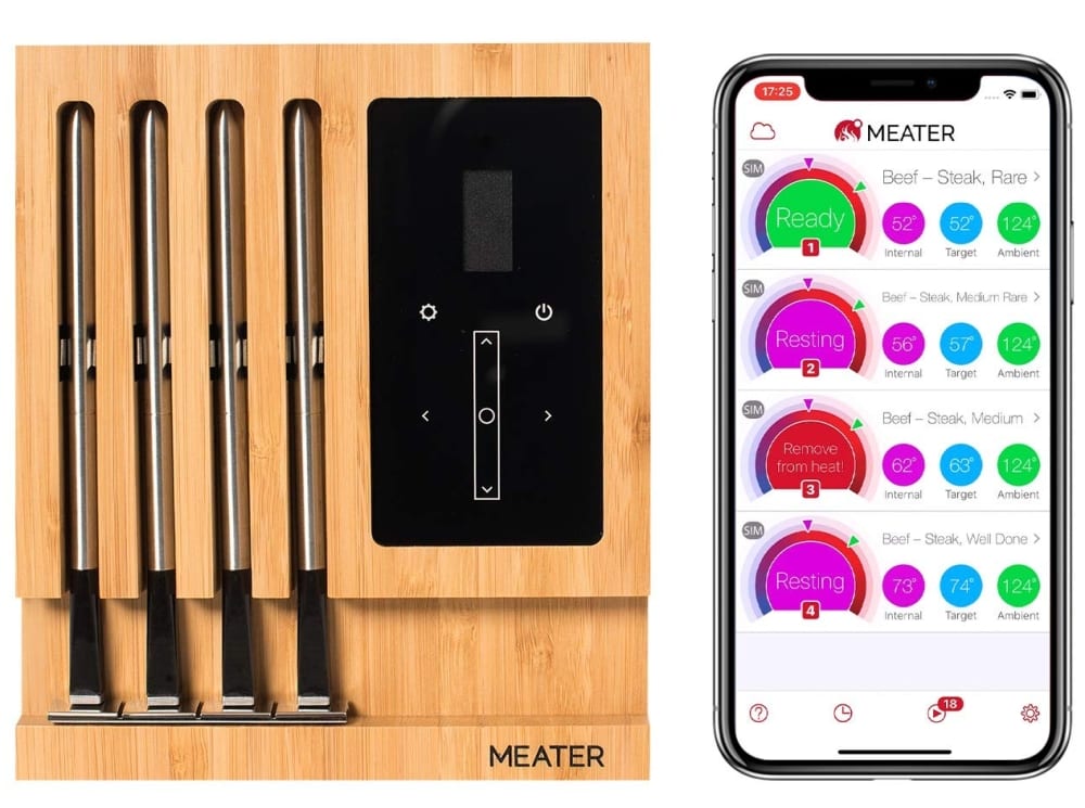 Home » Gadgets » MEATER Block Premium Wireless Smart Meat Thermometer Gadgets MEATER Block Premium Wireless Smart Meat Thermometer September 2, 2019 89 Monitor your food temperatures remotely and receive an alert on your smart phone when your food is ready!? Longer Range: Bluetooth to WiFi range extension built-in up to 165ft. Stand-Alone Mode: Cook without the use of your smart phone.? 4 Probes: Dual temperature sensors in each probe can monitor internal meat temperature up to 212°F and ambient / external temperature up to 527°F simultaneously.? Guided Cook System: Walks you through every step of the cooking process to guarantee perfect and consistent results. You can also set up custom alerts / notifications based on temperature and/or time.? Advanced Estimator Algorithm: Can estimate how long to cook and rest your food to help plan your meal and manage your time.