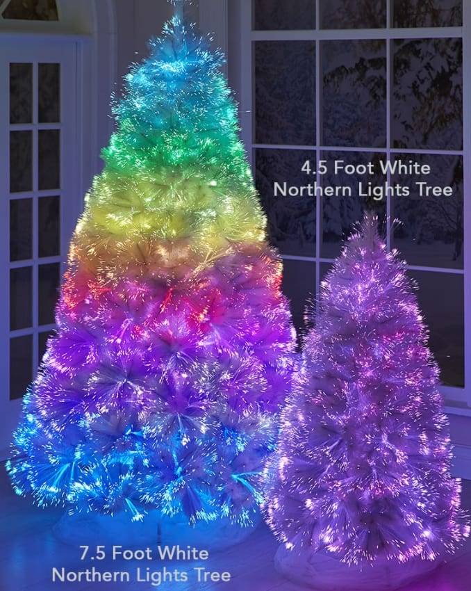 This is the fiber optic Christmas tree that creates a dancing cascade of colors along its branches. Using LEDs to illuminate fiber-optic tips, the white tree lights a room with an auroral effect that displays an array of bright holiday colors in 23 different synchronized patterns. The controller enables one to easily select a lighting option, cycle through each mode, and set the timer to turn the tree on for eight hours and off for 16 hours. Its sections stack and lock into place for ease of setup and rests on the included metal stand.