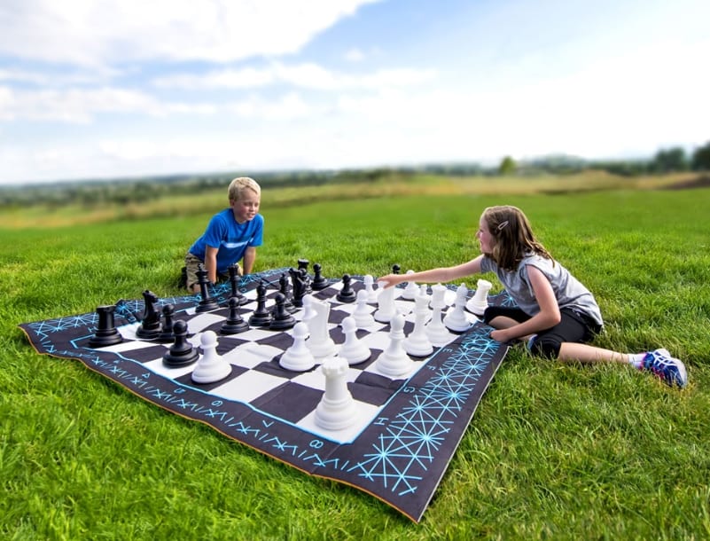 This is the game set that accommodates a Brobdingnagian with over-sized chess and checkers pieces. The 32 chess pieces and 24 checkers pieces share a 70″ L x 62″ W game mat that has a waterproof backing for indoor and outdoor usage.