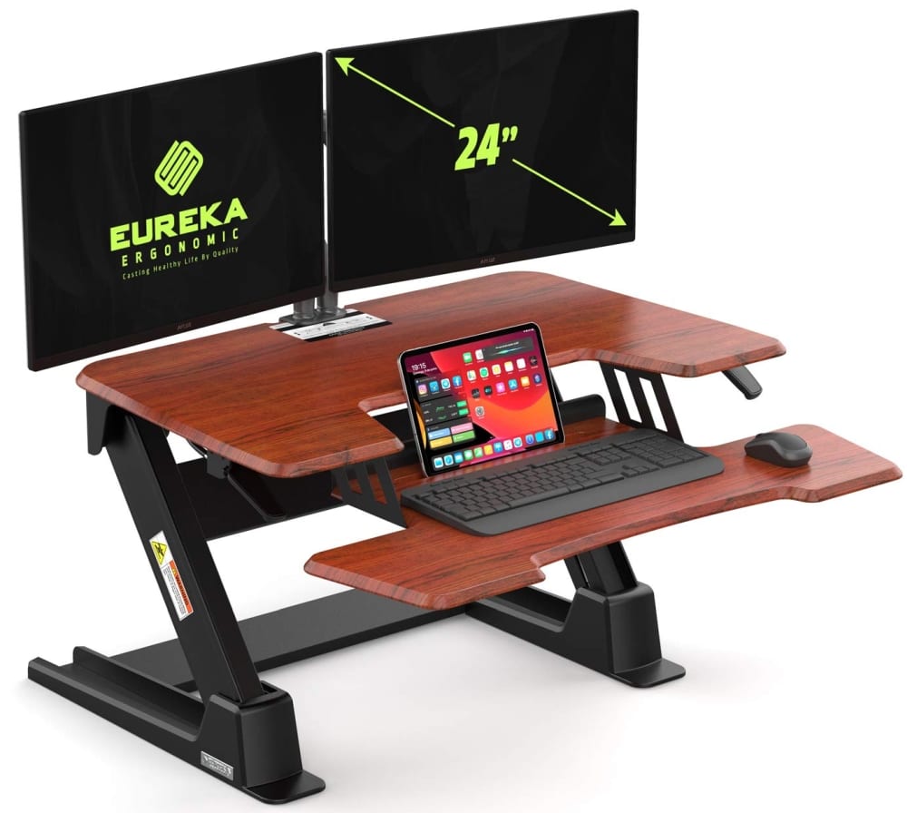 Home » Furniture » Eureka Ergonomic V2 Gas Spring Standing Desk Converter Furniture Eureka Ergonomic V2 Gas Spring Standing Desk Converter October 3, 2019 51 EUREKA ergonomic height adjustable standing desk features step-less height adjustments, no cranking or clicking. Sturdy dual gas springs enable our stand up desk to lift two monitors (up to 27″ each) or other combinations weighing up to 35 lbs. Can effortlessly adjust it from sitting to standing with any height levels you desire.adjustable standing desk converter has large ergonomic workspace with an upper tier (36” x 22”), perfect for dual monitors. The lower tier of sit stand desk is a wide-angle design keyboard tray for standard keyboard, mouse and paperwork.Reinforced moisture-proof material makes our ergonomic standing desks safe and durable. EUREKA industry-leading patented lifting & locking mechanism with z-shaped design supports over 20,000 times adjustment of this rising desks. No gas strut exposed, components are covered for a safe sleek design.