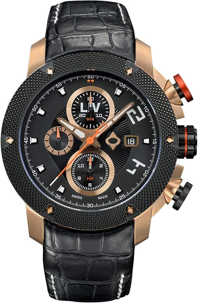 The GX-AC 25 jewel gold plated Swiss quartz movement is crafted in Switzerland, infusing it with a sense of history and tradition.The 46 millimeter easy to read three-dimensional multi-layered dial features luminous indexes and hands for excellent night visibility, and an orange seconds hand.The high-quality sapphire crystal on the front and back of the watch is anti-reflective and scratch resistant, making the watch look like new after many years of wear.Made in Switzerland: Features Black & Rose Gold Dial With Date, 25 Jewel Swiss Automatic Chrono, ETA Caliber 7750Screwed Down, Scratch Resistant, Sapphire Crystal Case Back & a Screw Down CrownIndividual Serial NumberWater resistant up to 100 meters (328 feet)