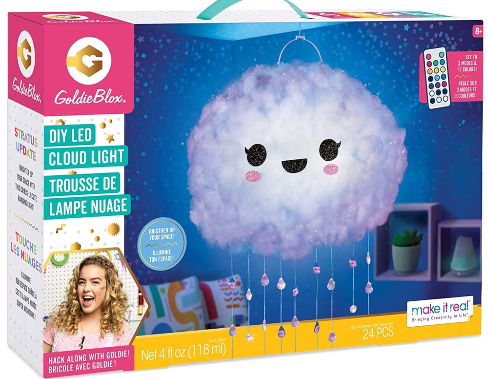 DIY FLOATING LED CLOUD LIGHT. Kids can decorate their rooms with this dreamy color-changing GoldieBlox cloud light! It’s a fun DIY craft activity that will make any bedroom brighter.HELPS KIDS LEARN ABOUT THE WORLD AROUND THEM. The DIY Floating LED Cloud Light helps makers learn how a circuit functions, while also providing information on what makes a cloud and how to tell the difference between cirrus, cumulus and stratus clouds.EVERYTHING INCLUDED. This DIY kit is a perfect way to let your child get creative and build their own Cloud Light. The kit includes a nylon lantern, lights & remote, 100% polyester fiber filling, foam glue and more!