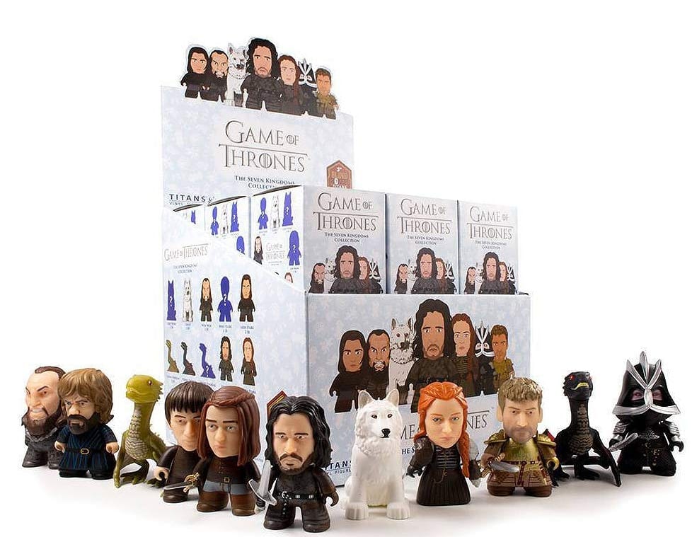 Full box tray of 18 blind box TITANS Game of Thrones 3″ figuresBlind boxes can be: Young Viserion, Jaime Lannister, Tyrion Lannister, Jon Snow, The Mountain, Arya Stark, Sansa Stark, Wun Wun, Ghost, Young DrogonAlso 5 hidden chase figures to collect!Item selection is random. Items are in blind packaging.18 boxes can contain any combination of characters.TITANS vinyl figures from Titan Merchandise