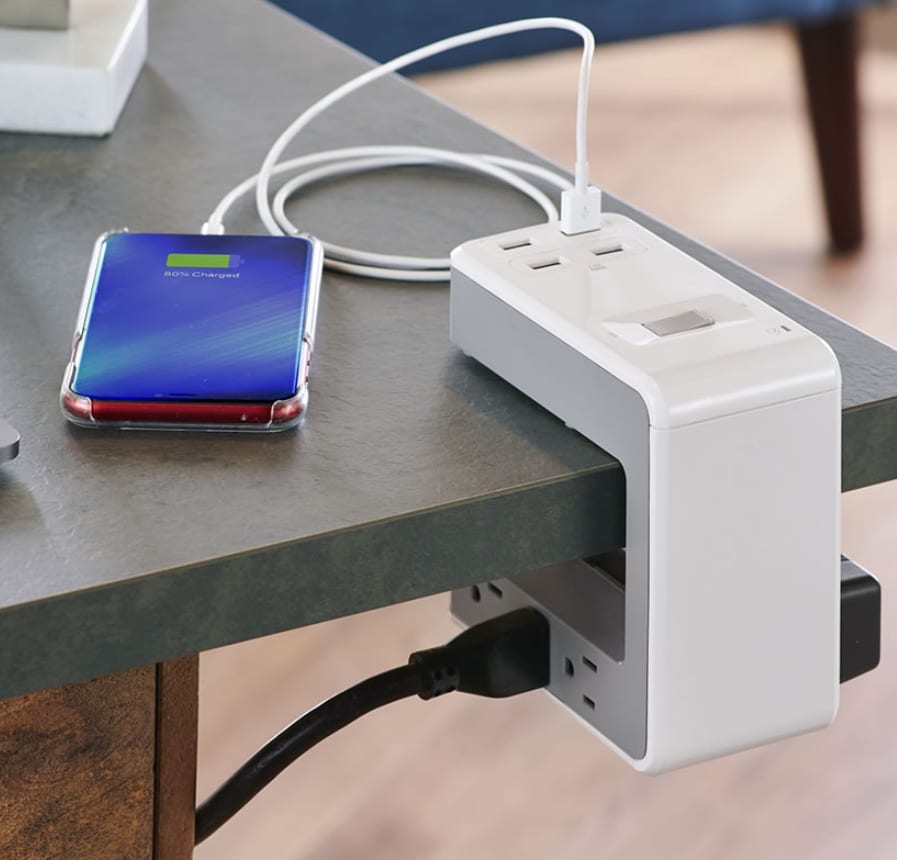 Home » Gadgets » The 10 Device Desktop Surge Protector Gadgets The 10 Device Desktop Surge Protector November 27, 2019 89 This is the power/charging station with surge protection that supplies power to 10 devices via six AC outlets and four 4.8-amp USB ports. It simultaneously supplies power to desk lamps, computers, and alarm clocks, while recharging smartphones, tablets, and other electronic devices, all while keeping your existing power cords off the floor. It has a unique C-shaped design enables it to clip around cubical walls or table/desk edges and EMI/RFI noise filtration that prevents interference from electronic devices.