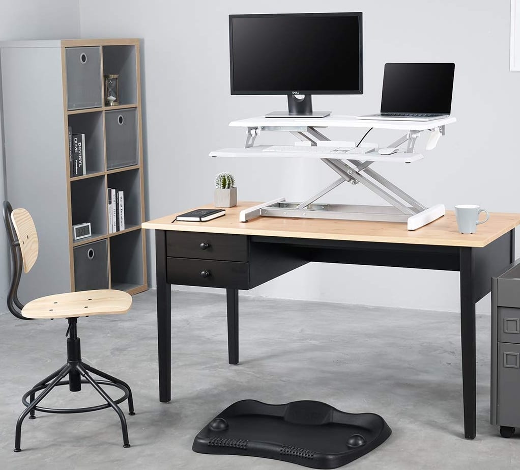 FEZIBO standing desk offers different comfort positions, allowing you to find that needed healthy balance between sitting and standing up throughout the day.Gas spring hovering system allows the tabletop workstation to adjust smoothly from sitting to standing by using a light squeeze of the handle. (Adjustable range: 4.5″ – 19.3″)The top surface measures 32.6″ W x 17.8″D providing plenty of space for a single monitor and monitor setups. Suitable for small tabletop workstation use.Ergonomic design standing desk. The solid structure keeps your riser steady and the maximum weight holds up to 28.6 lbs.