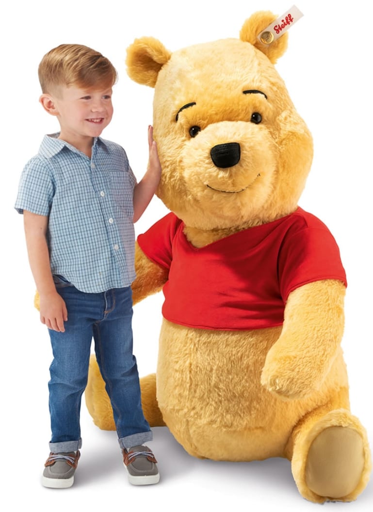 Made by Steiff, the foremost global authority on plush animals since 1880, this is the limited edition Winnie the Pooh. Based on the classic 1960s Disney version of A.A. Milne’s “silly old bear”, the plush Pooh is almost 3′-tall, sits upright, and has three-way disc joints in his head and arms that allow him to hold out his arms for a hug. Pooh has blond mohair fur, wears his iconic red shirt, and has the classic Steiff gold-plated “Button in Ear” that assures its superior quality and is numbered for authenticity.