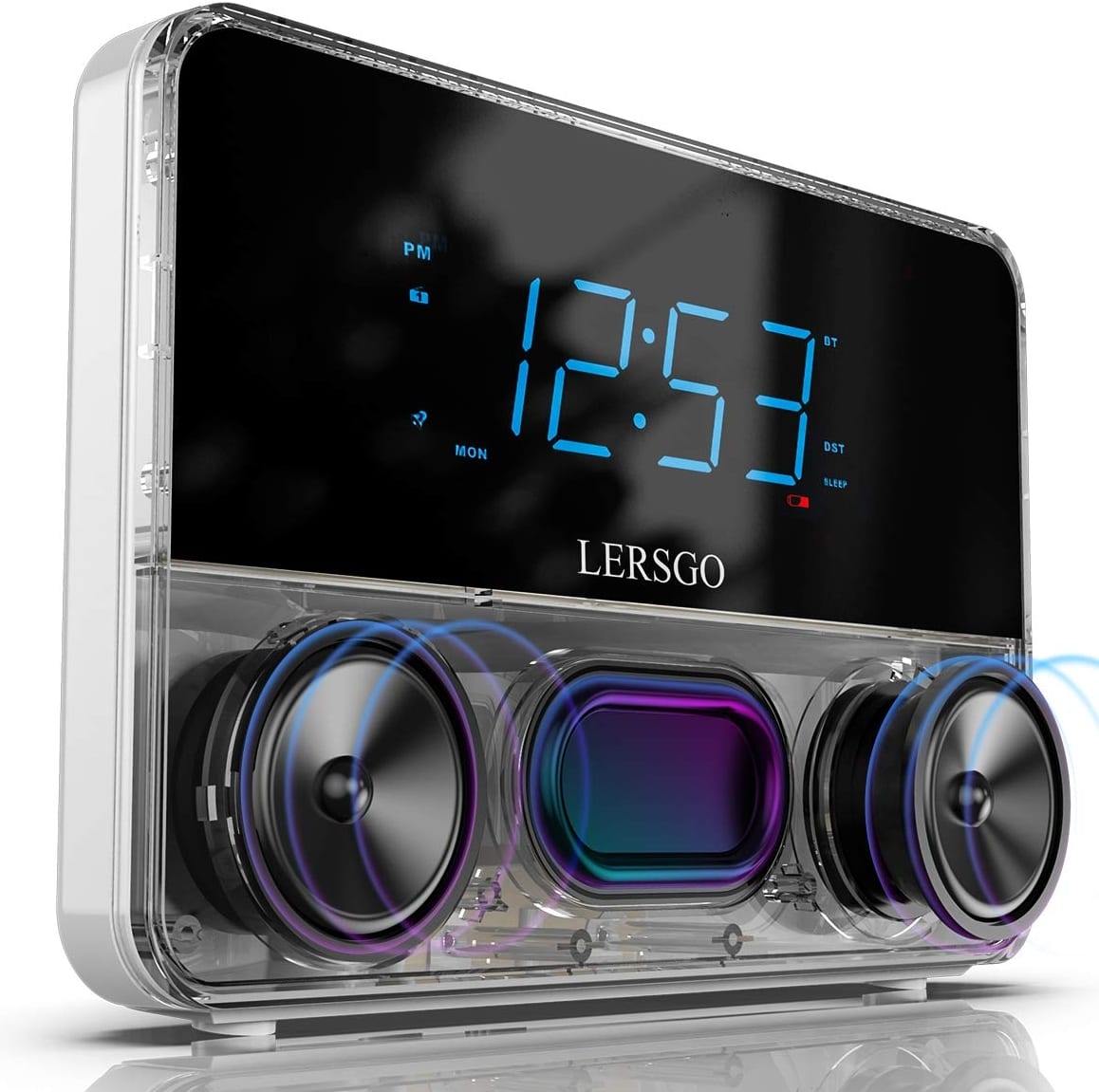Home » Gadgets » Clock Radio Bluetooth V5.0 Portable Speaker with HD Sound and Bass Gadgets Clock Radio Bluetooth V5.0 Portable Speaker with HD Sound and Bass February 11, 2020 73 PLL FM RADIO WITH SPLEEP TIMER- Built in FM radio, digital tuning provides easy access to each station. 0-30 level radio volume adjustable. Benefit sleep timer function lets you fall sleep to the radio by preset the radio to play for a certain amount time (09-99 minutes optional).BLUETOOTH 5.0 TECHNOLOGY- Equipped with advanced technology and compatible with all Bluetooth devices.HIGHER QUALITY CLEAR STEREO SOUND – accurate mid and clear highs from dual precision acoustic stereo driver, Enjoy your music in 4W full-bodied stereo.AUX IN JACK -connect from TVs and non-Bluetooth devices with a 3.5mm Line-In cable for the Perfect Line-In Speaker.USB CHARGING PORT- 5V/1A USB output interface at the back of the clock allows you to charge your smartphone, ipad or other smart device. Clock itself powered by AC outlet (110-240v, US plug adapter included). 2*AA batteries needed( not included) for memorize the settings, however the batteries doesn’t power the clock nor trigger the alarms.